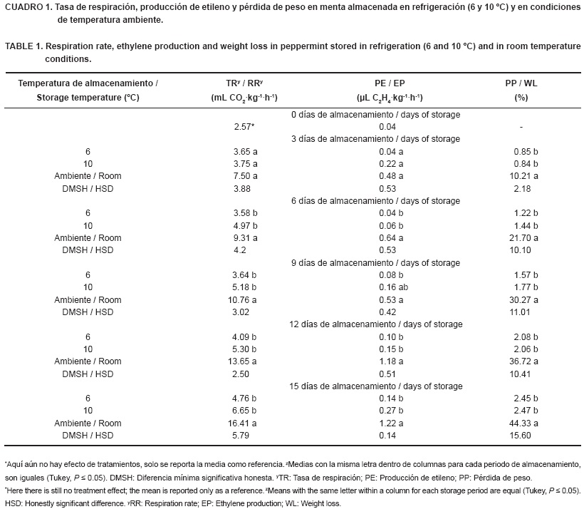 Se ha encontrado que uno de los síntomas de mayor deterioro durante la senescencia en los productos agrícolas como la menta, donde las hojas son la principal parte de interés, lo constituye el proceso de respiración (Thompson, 2003; Do Nascimiento y Pierre, 2003), el cual se ve afectado directamente por la temperatura (Smith et al., 2003). En este trabajo se encontró que a partir de los nueve días de almacenamiento (dda), el tratamiento a temperatura ambiente fue estadísticamente superior (P ≤ 0.05) respecto a 6 y 10 °C, con un rango de valores que fluctuaron de 9.31 a 16.41 mL CO2.kg-1.h-1 (Cuadro 1), similar a lo reportado por Kenigsbuch et al., (2007) en menta silvestre (Mentha longifolia L.) almacenada por seis días a 20 °C. Sin embargo, estos valores fueron menores a lo señalado por Loaiza y Cantwell (1997) en cilantro (Coriandrum sativum L.) manejado en condiciones de almacenamiento a 20 °C, con valores máximos de 70 y 94 µL CO2.g-1.h-1.