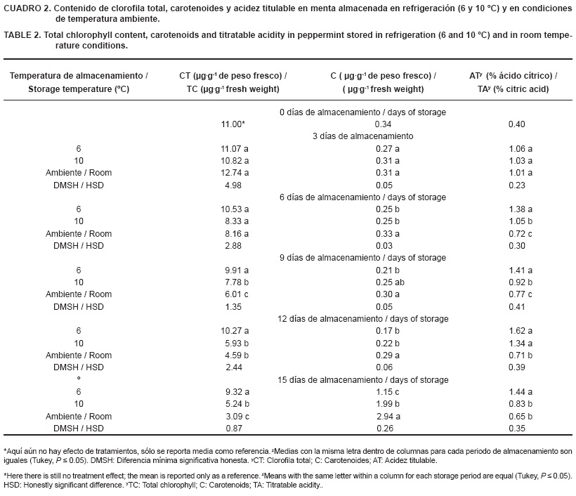 Los resultados obtenidos en el presente trabajo son similares a lo reportado por Hruschka y Wang (1979), Cantwell y Reid (2002) y Kenigsbuch et al. (2007), quienes mediante un estudio realizado sobre el almacenamiento y vida de anaquel en berro (Nasturtium officinale), perejil (Petroselinum crispum L.) y menta (Mentha piperita L.), respectivamente, demostraron que a 0 °C se conservan en excelentes condiciones por dos semanas. Adicionalmente, encontraron que la menta tiene una vida de anaquel más corta, debido a que después de tres semanas solo un 25 % de la planta era comercializable, comparado con el 45 y 60 % para perejil y berro.