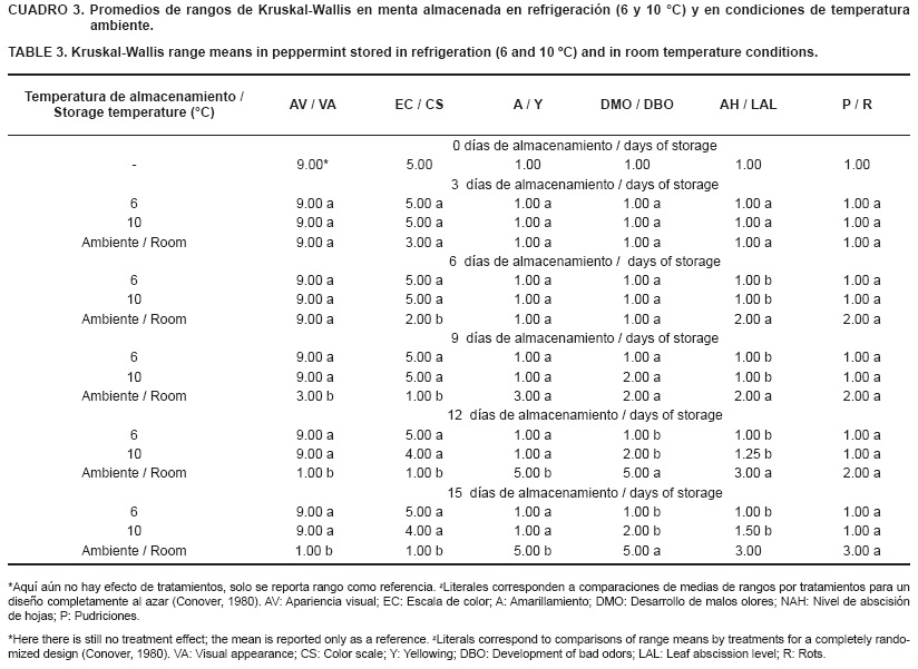 De acuerdo con el análisis no paramétrico de Kruskal-Wallis, se encontró que las bajas temperaturas (6 y 10 °C) favorecieron (P ≤ 0.05) una mejor apariencia visual (con valores de nueve; Cuadro 3), a los 6, 9, 12 y 15 dda, comportamiento que puede estar asociado con la disminución de la tasa de degradación de clorofila, y algunos procesos implicados con la senescencia (Laurila y Ahvenainen, 2002; Shewfelt, 2003). Lo anterior coincide con lo mencionado por Cantwell y Reid (1993), quienes reportan que la albahaca almacenada por 10 días a 10 °C mantuvo su apariencia visual de forma excelente y en buenas condiciones de comercialización.
