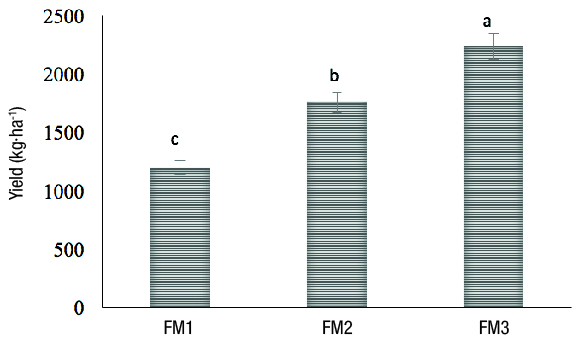 Figure 1 ‘Pinto Centauro’ bean yield under different fertilization management schemes: control FM1 (N, P and K, with 41, 46 and 22 kg·ha-1, respectively), fertilization FM2 (N, P, K, S and Zn, with 41, 46, 22, 12 and 1 kg·ha-1, respectively) and fertilization FM3 (N, P, K, S and Zn, with 45, 60, 22, 22 and 1.5 kg·ha-1, respectively). The vertical lines on each bar correspond to the standard deviation. Means with equal letters between bars do not differ statistically (LSD, P ≤ 0.05).