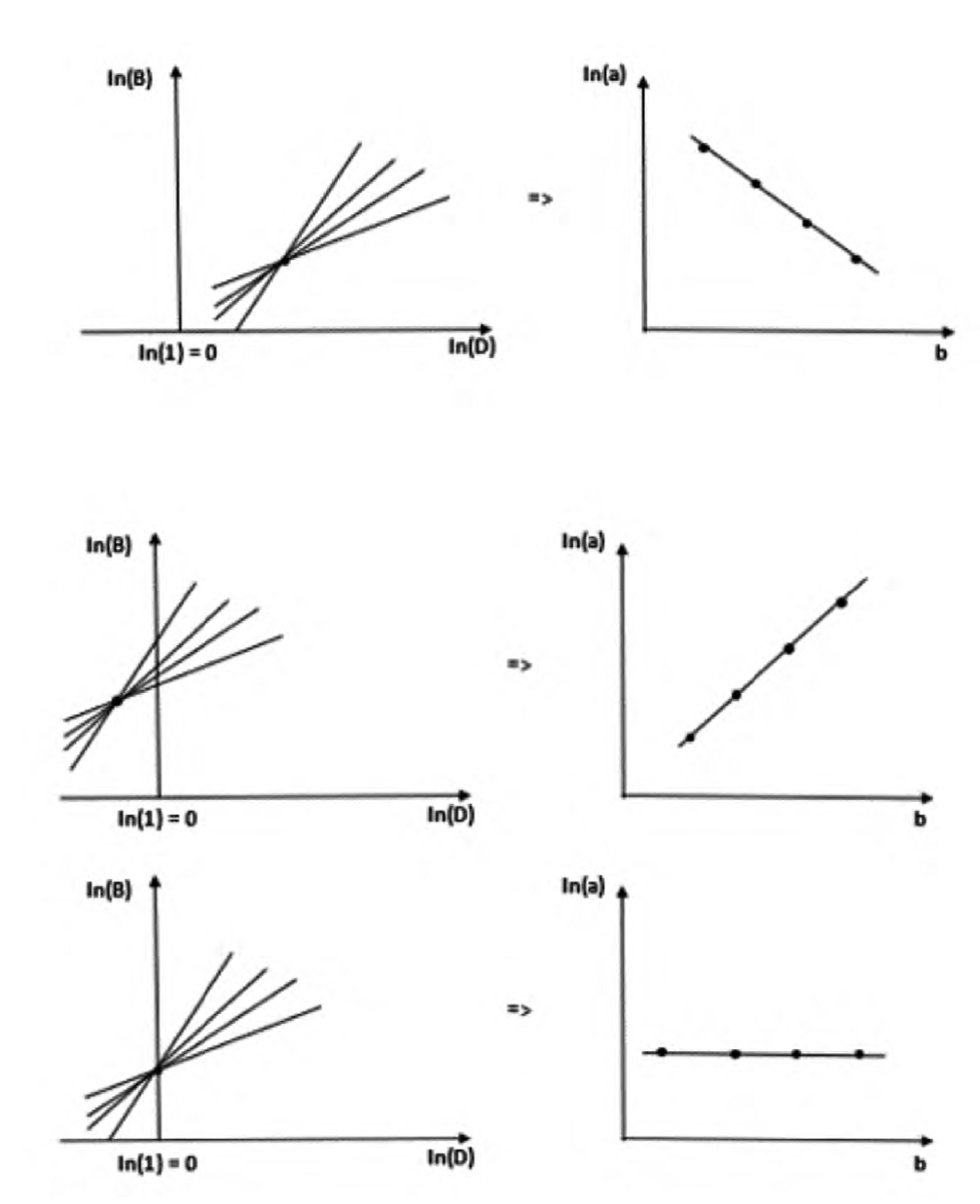 Para establecer una relación entre la constante (a) y el exponente (b) para un conjunto de parámetros del modelo alométrico B = aDb de diferentes especies de plantas o de la misma especie y diferentes sitios de muestreo, se puede partir de la propiedad de que los parámetros de un conjunto de líneas rectas que se intersectan en un punto común tienen una relación lineal entre ellos (Paz, Odi, Cano, Bolaños y Zarco, 2009). En el caso de las relaciones alométricas discutidas previamente, particularmente la ecuación (8) , se tiene que con una transformación logarít-mica se consigue: