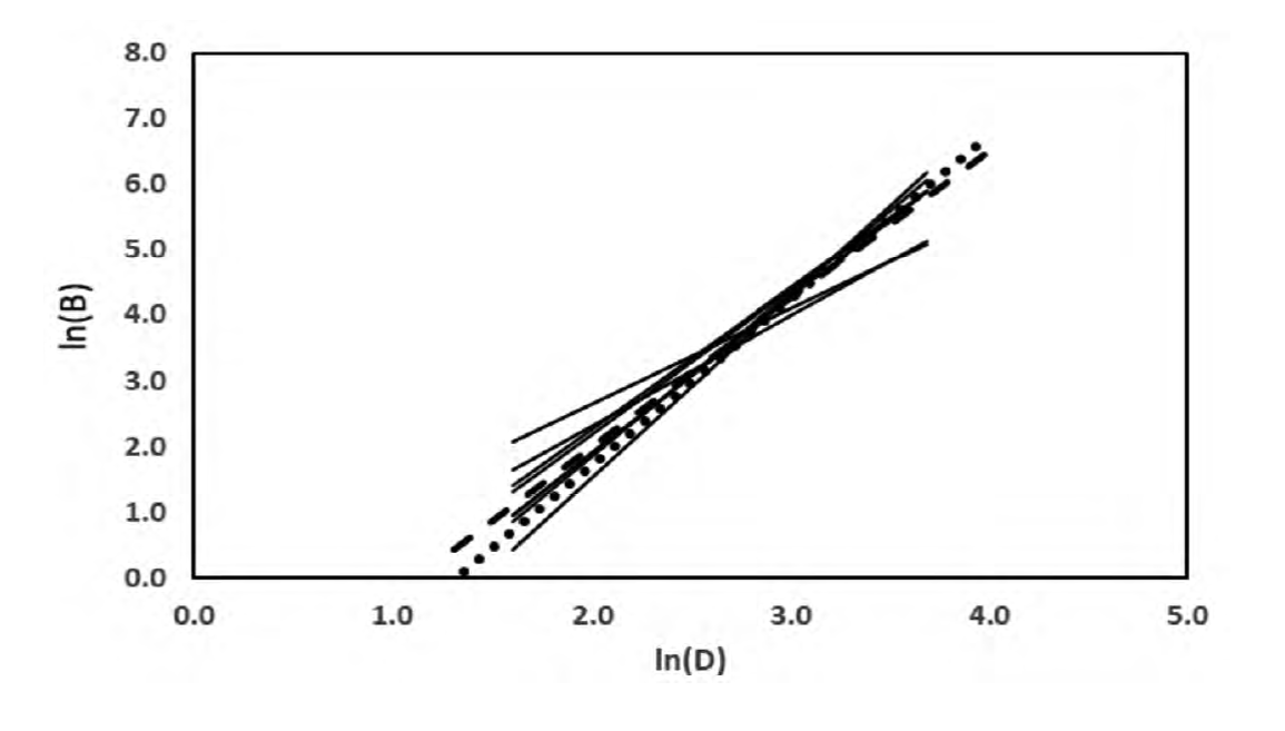 Figura 19 Ecuaciones generalizadas para el caso de siete sitios de muestreo de mezquite, Prosopis laevigata (Mendez et al., 2012). La línea punteada representa el ajuste a los datos originales B-D y la línea quebrada el ajuste a los puntos generados directamente de las ecuaciones alométricas con valores de D espaciados a intervalos regulares.