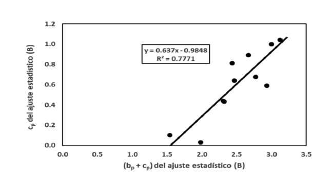 Figura 4 Relación entre el exponente (b p + c p) y c p, ecuación (17) para la base de datos de Zianis et al. (2005) para el caso de la biomasa (n = 13).