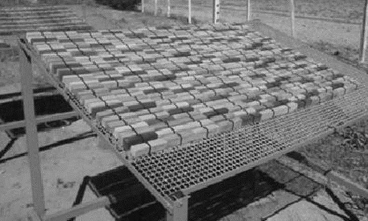 Os corpos de prova das cinco espécies amazônicas foram aleatoriamente dispostos sobre uma plataforma metálica, com tela de aço galvanizado de malha nº 8, de dimensões de 1,0 m × 1,5 m, com inclinação igual à latitude local e altura mínima de 1 m em relação ao solo, conforme metodologia adotada por (Cassiano et al., 2013). De modo a evitar a movimentação dos corpos de prova na plataforma metálica, procedeu-se a fixação com abraçadeiras de plástico (Fig. 1).