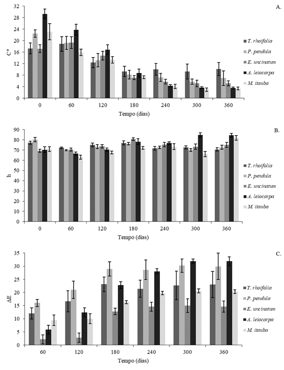 A cromaticidade (C*) é um parâmetro dependente das coordenadas cromáticas a* e b* (Bonfatti Júnior e Lengowski, 2018), sendo assim justifica-se o decréscimo de seus valores, proporcionando uma redução da saturação da cor das madeiras expostas ao intemperismo natural e um consequente aspecto acinzentado na superfície (Fig. 3A). O parâmetro C* representa o desvio a partir do ponto que corresponde ao eixo do parâmetro L*. Nesse sentido, quanto mais próximo ao eixo menor será a saturação da cor da madeira, indicando o aspecto acinzentado das madeiras.