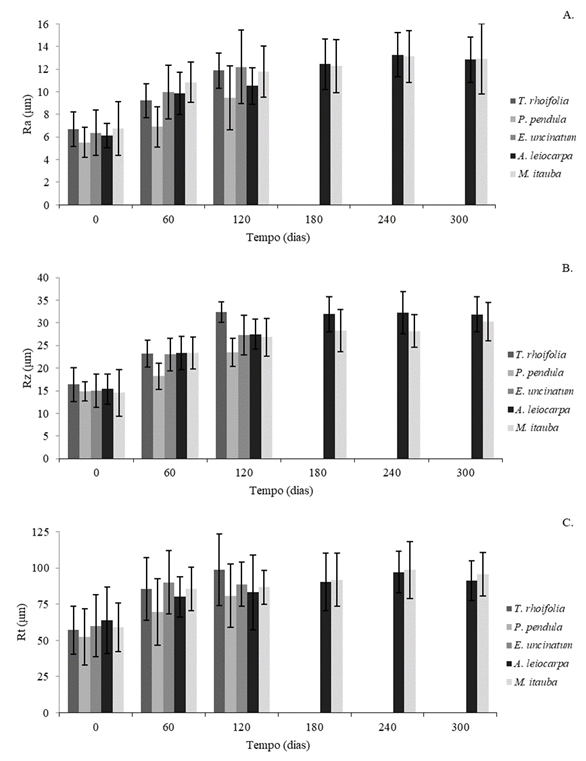 Em nenhuma das cinco espécies foi possível realizar o monitoramento dos parâmetros Ra (Fig. 4A), Rz (Fig. 4B) e Rt (Fig. 4C) até o final do período de intemperismo, devido à intensa deterioração superficial das madeiras. A rugosidade das madeiras de T. rhoifolia, P. pendula e E. uncinatum foi avaliada até 120 dias, enquanto para as madeiras de A. leiocarpa e M. itauba foi possível o monitoramento até 300 dias de exposição ao intemperismo natural. Essa diferença de rugosidade ao longo do tempo para espécies impediu o cálculo da correlação de Pearson para essa característica.