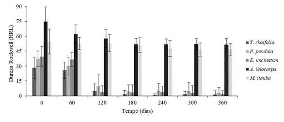 A dureza Rockwell das madeiras intemperizadas (Fig. 5) apresentou variação semelhante ao da rugosidade superficial, em que as madeiras de A. leiocarpa e M. itauba se destacaram pela maior estabilidade da dureza durante o período de avaliação. Por sua vez, as madeiras de T. rhoifolia, P. pendula e E. uncinatum apresentaram uma significativa redução após 120 dias de exposição; em algumas amostras intemperizadas de T. rhoifolia, P. pendula e E. uncinatum foram registrados valores nulos de dureza, devido a intensa deterioração superficial, influenciando no coeficiente de variação dos valores. Turkoglu et al. (2015) também verificaram redução significativa nos valores de dureza König das madeiras de Pinus sylvestris e Fagus orientalis após 180 dias de exposição ao intemperismo natural, sendo as perdas de dureza equivalentes a 75% e 85%, respectivamente.