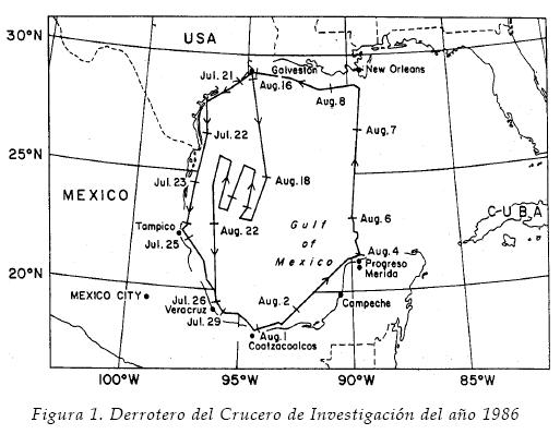 En los meses de julio y agosto de 1986 se llevó a cabo un proyecto bilateral entre México y los Estados Unidos, con el objeto de estudiar la química de la atmósfera en el Golfo de México. Este crucero se inició en Galveston, Texas, el 20 de julio de 1986, y se concluyó en Veracruz, México, el 23 de agosto de ese mismo año (Figura 1). La Secretaría de Marina de México proporcionó el buque oceanográfico H02 para llevar a cabo esta investigación. Los resultados obtenidos en este proyecto se encuentran documentados en el informe correspondiente, en el cual se llevaron a cabo determinaciones químicas, físicas, meteorológicas y oceanográficas para evaluar su variación temporal en el Golfo de México (Parungo y Miller, 1988 y Parungo et al., 1990).