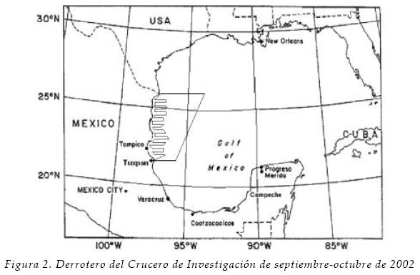 El itinerario seguido por el crucero de septiembre a octubre de 2002 se enfocó a la Plataforma Continental del Oriente del Golfo de México (Figura 2), mientras que el de noviembre a diciembre del mismo año, el de septiembre a octubre de 2003, y el de mayo a junio de 2004 se llevaron a cabo en la Plataforma Continental del Sur del Golfo de México (Figura 3).