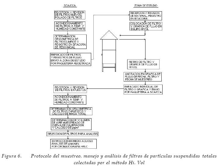Dependiendo del tipo de filtro utilizado, el intervalo de colección de partículas puede incrementarse hasta cerca de 100 µm. La masa de las partículas colectadas se determina por la diferencia de masas (m2m1), como se indicó antes, mientras que para determinar su concentración (expresada en µg/m3), se debe conocer el volumen de aire que se filtró, en el intervalo de tiempo de muestreo, que por norma es de 24 h. Para el caso específico de los cruceros de investigación, se llevó a cabo el muestreo cada 12 h, con el propósito de determinar la variación de las concentraciones de las partículas durante el día y la noche. Posteriormente, y para fines de comparación con la norma correspondiente para PST, se integraron las muestras del día y de la noche en una sola, para obtener un tiempo total de muestreo de 24 horas. La Figura 5 muestra el colector de las PST, ubicado a bordo del buque oceanográfico "Justo Sierra", en un sitio que reunió condiciones de seguridad, disponibilidad de energía eléctrica, y libre de obstáculos, con el propósito de obtener mediciones representativas. Por otra parte, el protocolo de la preparación y manejo de los filtros para el muestreo de las PST utilizado en la Sección de Contaminación Ambiental se presenta en la Figura 6.