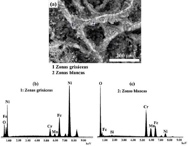 La Figura 7a muestra la imagen del crecimiento incompleto del recubrimiento sobre la superficie de fractura de la muestra A tratada térmicamente a 1000°C por 30 min empleando una velocidad de calentamiento de 10°C/min. Se aprecian zonas blancas del recubrimiento incompleto y zonas de color grisáceo mediante la técnica de electrones dispersados en el microscopio electrónico de barrido. Estas formaciones de compuestos se favorecen en las crestas de los microporos debido a una mayor energía superficial. Los espectrogramas de la Figura 7b y c muestran la naturaleza química de la zona grisácea (1) y blanca (2) analizada por la técnica de energía dispersiva de rayos-X. La Figura 7b muestra la composición química de las zonas grisáceas con picos intensos de níquel (Ni) y picos menos intensos de oxigeno (O), hierro (Fe) y cromo (Cr), así como picos de menor intensidad de Mn. Mientras tanto, las zonas en tonalidad blanca (2) muestran un pico intenso de oxígeno (O) y cromo (Cr), además de los elementos propios de la aleación (Figura 7c). Se establece que corresponden a óxidos de cromo.