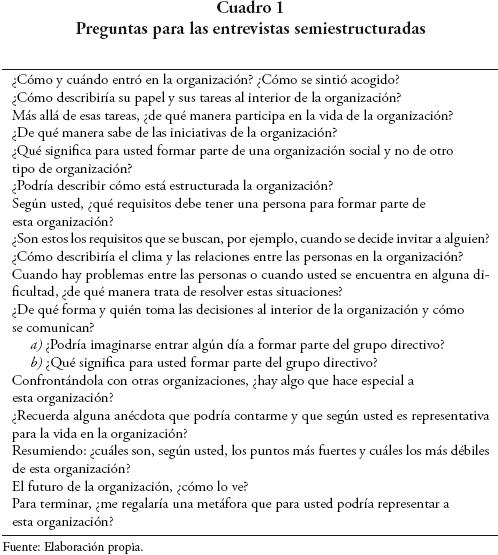 Utilizamos instrumentos de recopilación de datos cualitativos típicos para la etnografía organizativa: observación participativa, entrevistas etnográficas y análisis de contenido de los textos escritos y de los artefactos organizacionales (Piccardo y Benozzo, 1996: 104). Mientras que la observación participante se desarrolló de manera libre (sin un formato predefinido) a partir de la escritura de notas de campo,8 las entrevistas fueron en su mayoría semiestructuradas y guiadas por un guión de preguntas predefinidas y acordadas con los sujetos participantes en la investigación (cuadro 1).9