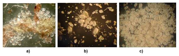 Los cultivos puros mostraron máximo crecimiento entre la cuarta y quinta semana de iniciación del cultivo, observándose individuos de ambos sexos, huevos y estados larvales (Figura 1). En la quinta semana, la producción promedio de ácaros fue de 0,9 g/300 g de medio. Después de la quinta semana se detectó un alto número de ácaros muertos en el tapón de gasa de los matraces, lo que sugiere agotamiento del medio de crecimiento. Para los experimentos de extracción se utilizaron cultivos con cinco semanas de crecimiento.