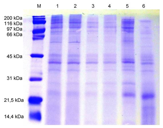 El análisis electroforético de los extractos mostró presencia de bandas con tamaños entre 21 y 200 kDa. Los extractos obtenidos a partir de los cultivos A y B mostraron bandas más nítidas y un patrón de proteínas similar al observado en el extracto de referencia de B. tropicalis (Inmunotek) (Figura 2).