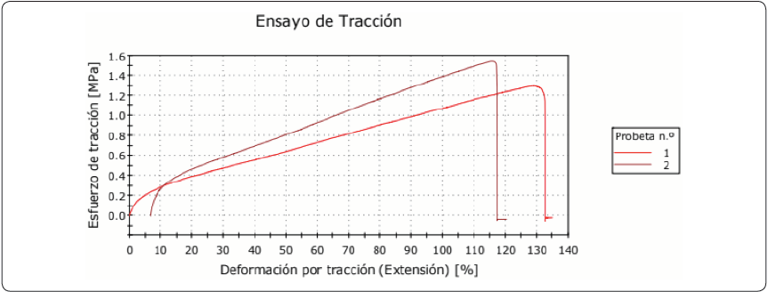 Los resultados de las pruebas mecánicas en películas formuladas con jugo clarificado de cladodios silvestres tiernos de O. megacantha, se desprenden del ensayo de tracción que se muestra en la Gráfica 1. Se tuvo una resistencia a la tensión de 1.42 + 0.17 MPa semejante a las de las películas de albúmina de huevo (Gennadios, Brandenburg, Weller & Testin, 1993), del gluten de trigo (Gennadios et al., 1993; Anjum et al., 2007), de la proteína de cacahuate (Liu, Tellez & Castell, 2004; Hwang et al.,2010) y del aislado de la proteína de soya (Gennadios et al., 1993), con respecto a la elongación a la rotura, ésta fue de 124.16 + 15.04% en el presente trabajo y es similar a la de las películas de aislado de la proteína de soya (Gennadios et al., 1993) y de la proteína de cacahuate (Liu et al., 2004; Hwang et al., 2010), tanto la resistencia a la tensión como la elongación a la rotura de películas producidas con mucílago de nopal y glicerol; y de mucílago de nopal, glicerol y calcio en el trabajo de Espino et al. (2010), son menores a las de las películas preparadas con jugo de nopal decantado de O. megacantha, proteína animal, glicerol y cera del presente trabajo. El módulo de Young de las películas del presente estudio fue 1.77 + 0.42 MPa.