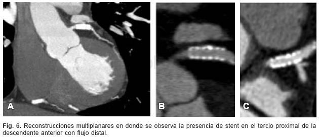 Actualmente existen todavía pocos trabajos que hayan evaluado el papel de la TCMD en condiciones postintervención coronaria. Además, la gran mayoría de estos estudios incluyen poblaciones de estudio seleccionadas y pequeñas.61"65 Con el empleo de tomógrafos de ≥ 16 detectores en pacientes con una alta prevalencia de stents de gran calibre, sólo es posible obtener imágenes de calidad diagnóstica en el 75% de los pacientes. Para aquellos segmentos valorables, la detección de una estenosis de por lo menos el 50% tiene una sensibilidad del 78 al 100%, con una especificidad del 92 al 100%. La especificidad disminuye al 75% cuando todos los segmentos coronarios son incluidos para el análisis Si se consideran todos los grados de estenosis intrastent (< 50%, > 50% y oclusiones completas), el desempeño de la TCMD es bajo, sin embargo éste aumenta sustancialmente cuando únicamente son consideradas las estenosis significativas, con VPN por arriba del 90% (IC 95%, 84.696.8), lo cual permitiría a la TCMD descartar de manera confiable aquellos pacientes con estenosis significativas.62