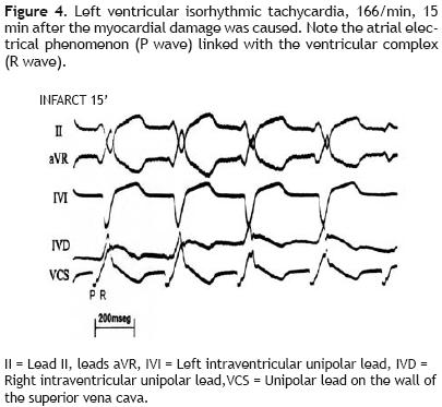 Figure 4 exhibits a left ventricular isorhythmic tachycardia, 166/min, and the morphology of ventricular complexes corresponding to an advanced degree RBBB, due only to myocardial damage by phenol. P waves patched to R waves can be seen.