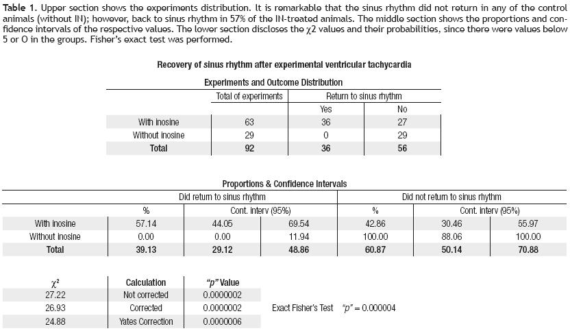 To contrast the distribution proportions of the animals treated with inosine that went into SR, and those of the control animals Table 1, the data were submitted to the χ2 statistical test, which revealed 27.22; and 24.88 with Yates correction. The statistical level of significance was p = 0.0000006, and with Fisher's Exact Test, p = 0.000004. Calculations were performed using Epi Info version 6.04b of CDC WHO (2007) Geneve, Switzerland. The confidence intervals limits for proportions with a 0.95 significant level (ICL = Inferior Confidence Limit; SCL = Superior Confidence Limit) were consulted from "Confidence Limits for p", in Scientific Tables; Documents Geigy. Konrad Diem, Basel 1965, p 8.