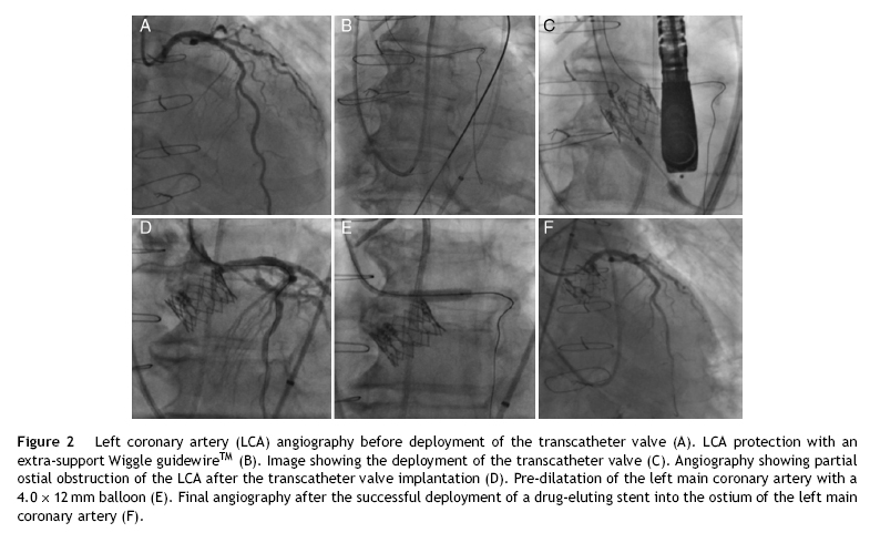 Transcatheter aortic valve implantation (TAVI) has emerged as an effective option for the treatment of high-risk patients with native aortic stenosis.1 Furthermore, there has been a rapid expansion of TAVI toward a larger spectrum of patients, such as those with degenerative surgical bioprosthesis.2 While the procedure is successful in most cases, some life-threatening complications such as coronary obstruction still remain.3,4 Anatomical factors such as low lying coronary ostia and shallow sinus of Valsalva have been associated with a higher risk for coronary obstruction,3 but no specific preventive measure has been established to date for this life-threatening complication. To this effect, we describe the case of a patient considered at high surgical risk for conventional aortic valve replacement in whom TAVI was carried-out. Due to high-risk features for coronary obstruction we decided to protect the left main coronary artery with a coronary guidewire prior to valve implantation.