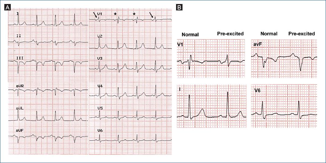 Figure 2 A: sinus rhythm with intermittent preexcitation, note that when there is no preexcitation, the RBBB is observed (stars) and when there is antegrade conduction through the AP (accessory pathway), the RBBB is masked (arrows). B: comparison between normal and pre-excited complexes, note that despite the existence of preexcitation the PR interval is normal in some leads.