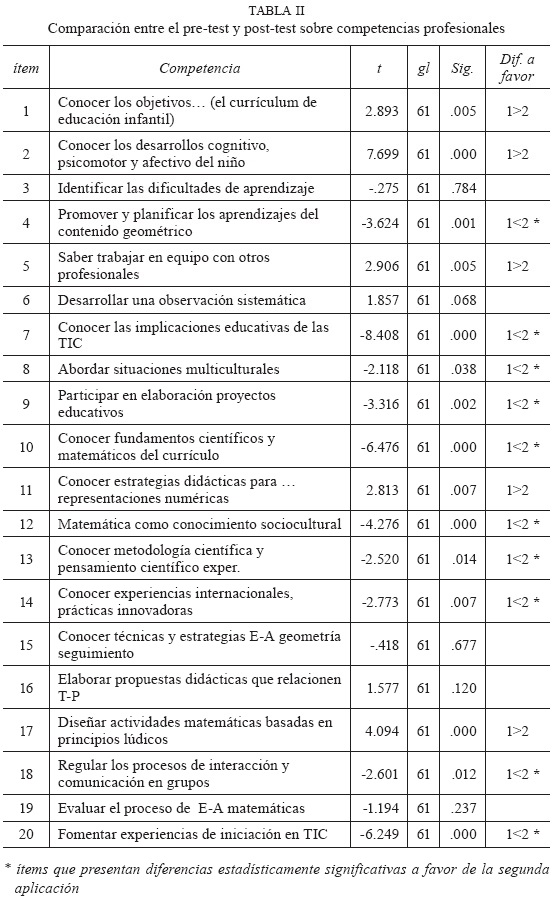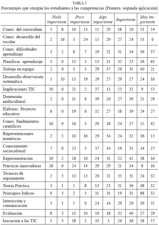Al inicio del curso, los estudiantes para maestro consideraban más importante aquellas competencias profesionales relacionadas con el conocimiento pedagógico general. Así por ejemplo, un 53 por ciento de los estudiantes consideraba fundamental Conocer los objetivos, contenidos y criterios de evaluación de la educación infantil (el curriculum de educación infantil) y Conocer los desarrollos cognitivo, psicomotor y afectivo del niño en los periodos de 0-3 y de 3-6 años. Uno de los aspectos menos valorados por los estudiantes al inicio del curso fue la incorporación de las TIC, sólo un 10 por ciento de los estudiantes considera una competencia fundamental el Conocer las implicaciones educativas de las tecnologías de la información y la comunicación, y un 15 por ciento de ellos opina que es importante Conocer los fundamentos científicos, matemáticos y tecnológicos del curriculo de educación infantil. Asimismo, sólo un 18 por ciento de los estudiantes señala que Fomentar experiencias de iniciación en el uso de las tecnologías de la información y comunicación es una competencia fundamental para el ejercicio profesional. Otro aspecto que es escasamente valorado por los estudiantes (15 por ciento) es la Comprensión de las matemáticas como conocimiento sociocultural. De interés resulta que la mayor valoración mostrada por los estudiantes está referida a Diseñar actividades matemáticas basadas en principios lúdicos (68 por ciento) y Elaborar propuestas didácticas que relacionen la teoría y la práctica (48 por ciento).