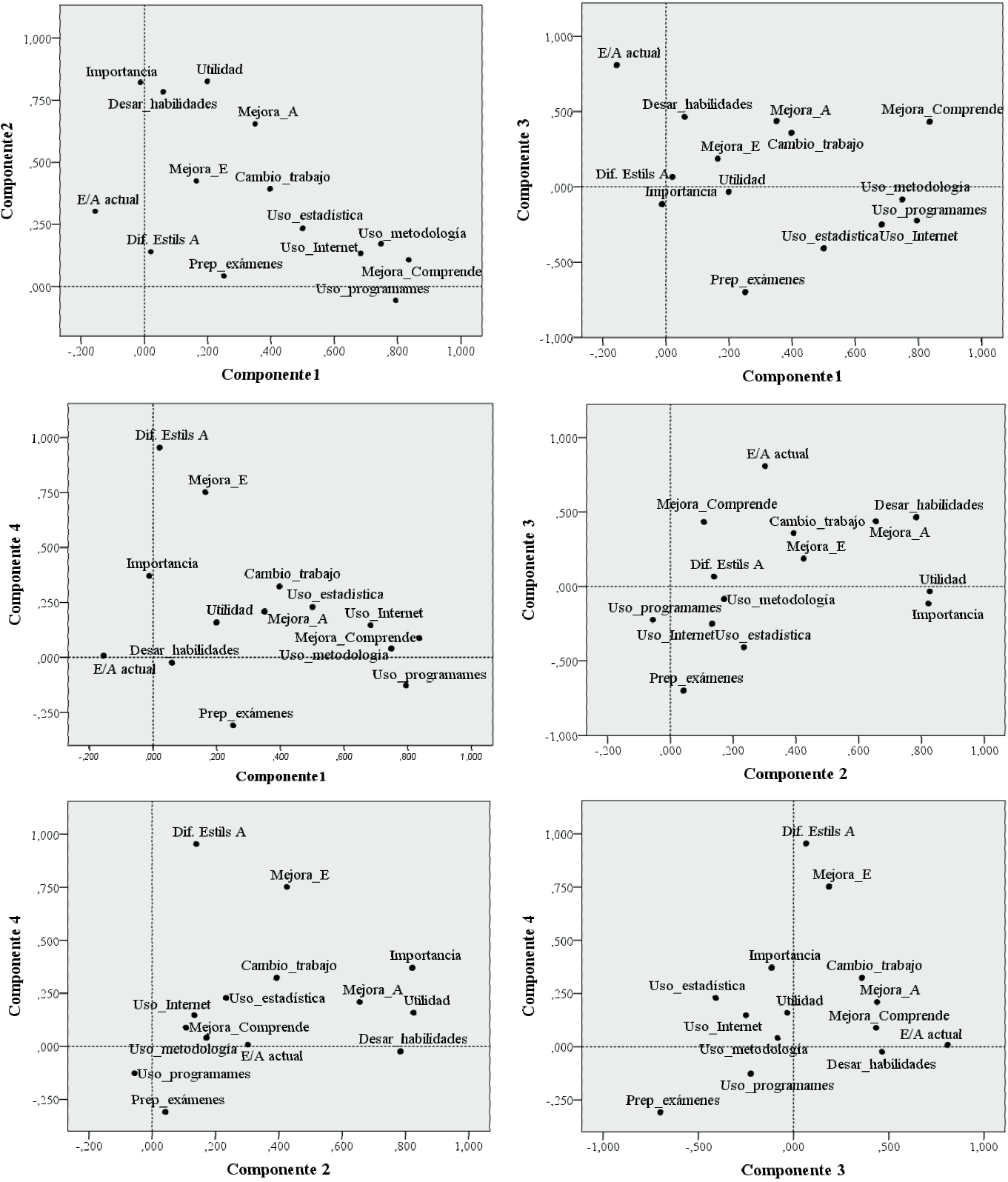 La Figura 2 muestra la representación de las componentes de cargas rotadas. Las coordenadas vienen dadas por los respectivos coeficientes de correlación entre la variable y la componente, de forma que las variables saturadas en una misma componente aparecen agrupadas. Las variables al final de un eje son aquellas que tienen correlaciones elevadas sólo en ese factor y, por consiguiente, lo describen. Las variables cercanas al origen tienen correlaciones reducidas en ambos factores. Finalmente, las que no están cerca de ninguno de los ejes se relacionan con ambas componentes.