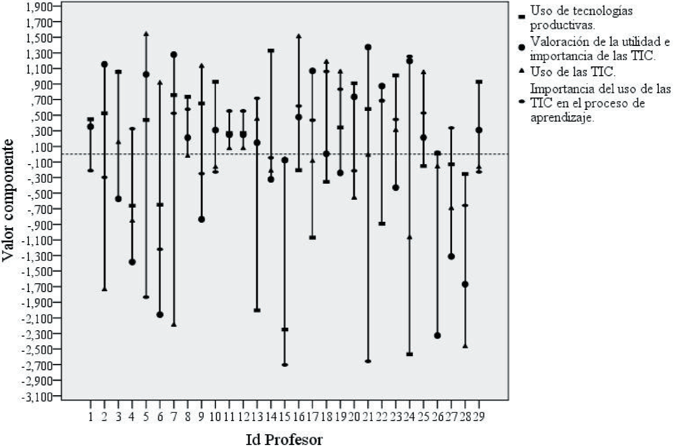 • - Componente 1, Uso de tecnologías productivas: Este componente trata de la relación del usuario con las tecnologías en general; dependiendo de los signos (en este caso positivos), puede interpretarse como la valoración o la disposición del individuo al uso de tecnologías en los procesos de enseñanza-aprendizaje.