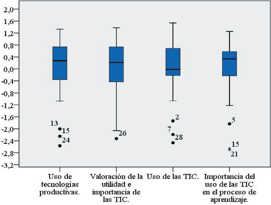 Por otro lado, haciendo un análisis global y comparativo, la Figura 5 muestra el boxplot múltiple de los 4 factores identificados. Es posible observar que los valores máximos tienen cierta tendencia a coincidir, a diferencia de los valores mínimos en donde destaca el factor valoración de la utilidad e importancia de las TIC. De manera general se aprecia que los 4 factores no presentan diferencias significativas: 3 de ellos tienen el 50% de las observaciones medidas por encima del cero, confirmando predisposición positiva al uso de las TIC.