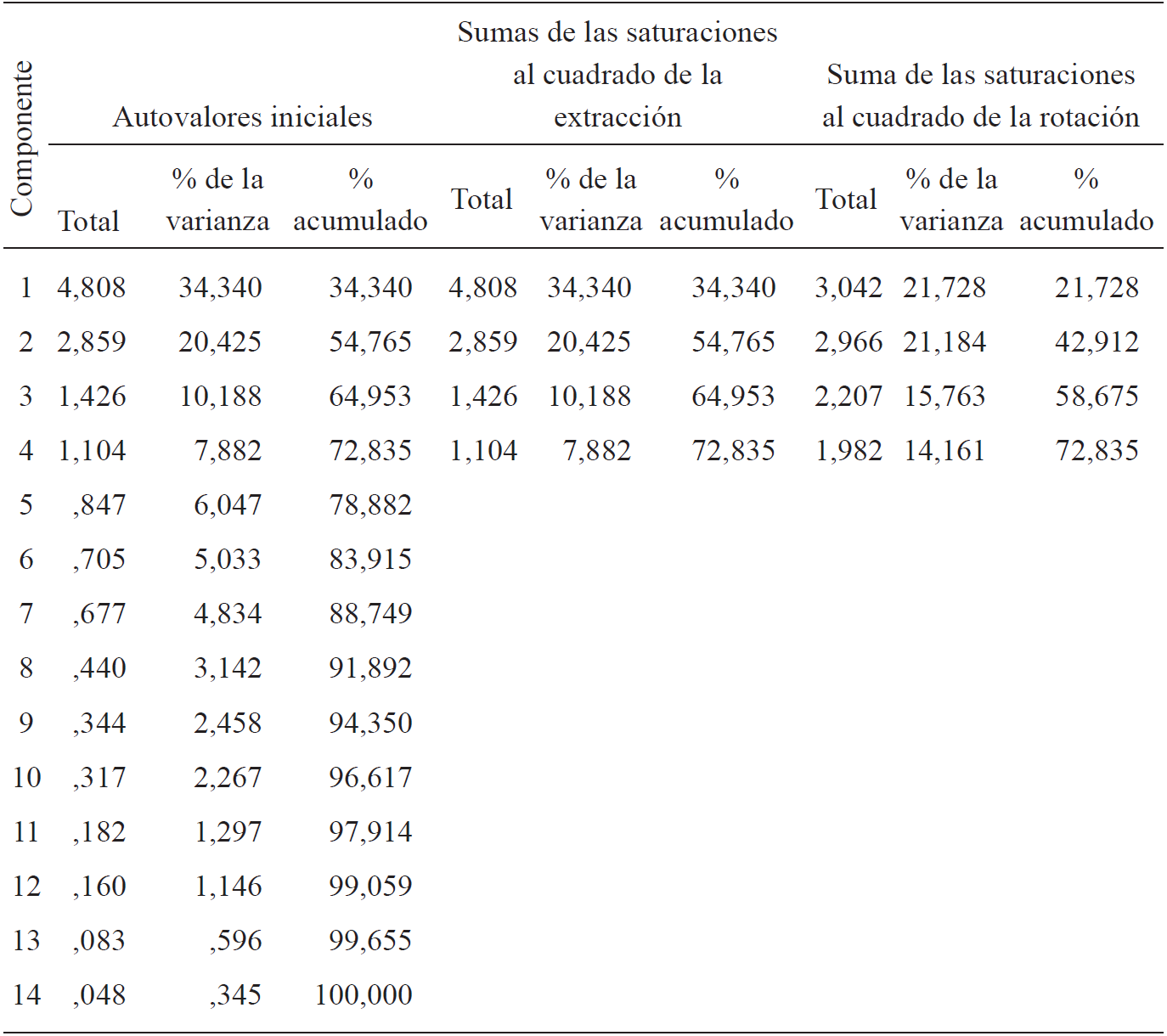 Cabe observar que, previo a la rotación, el primer factor presenta un autovalor tras la extracción factorial igual a 4,808 (ver Tabla II), representando éste un 34,340% de la varianza explicada. Al rotar los ejes de los factores se produce una redistribución de la varianza, lo que desencadena cambios en la variabilidad explicada por cada factor, disminuyendo en el primero y redistribuyéndose entre los otros dos, sin que ello implique cambios en la varianza total explicada (Tabla I). Ésta se mantiene en el 72,84%, lo que significa que los 4 factores hallados explican casi un 73% de la varianza total -i.e. la pérdida de información es de un 27%, aproximadamente-.