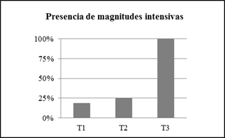 A pesar a la escasa presencia de las magnitudes intensivas en los textos analizados, llama la atención que todos los problemas de tipo T3 involucren al menos una magnitud de esta naturaleza, mientras que en más del 75% de los problemas de las otras tipologías se da una ausencia total de magnitudes intensivas.
