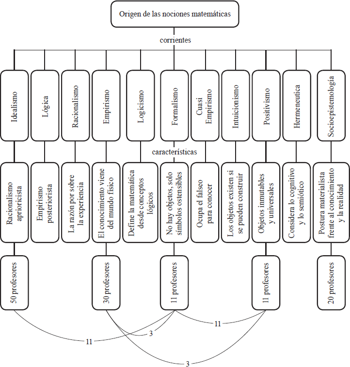 Al contrastar la información recogida de los profesores con la revisión teórica hecha para este estudio pudimos identificar relaciones entre sus declaraciones y algunas posturas clásicas de como se ha entendido el conocimiento matemático en la historia. La Figura 3 muestra como relacionamos los enunciados del profesorado con las corrientes del pensamiento sobre el conocimiento matemático identificables en la historia.