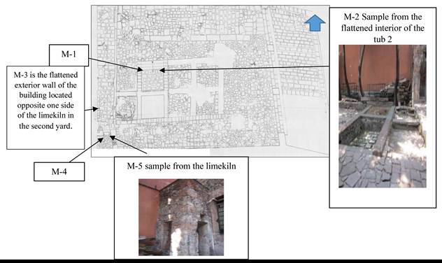 Samples M-1 and M-2 were obtained from the flattened interior of the tub 2 in the northwest corner, M-3 from the flattened exterior wall of the building located opposite one side of the limekiln that was in the second yard, the samples M-4 and M-5 correspond to the internal flattened kiln. All these samples were located in the second yard, sample M-6 is part of the building material of the corridor and the last sample M-7, corresponds to the lime that was used as cement between each block of quarry that was part of the pilaster. These last two correspond to spaces of the first yard (Figures 2 and 3).