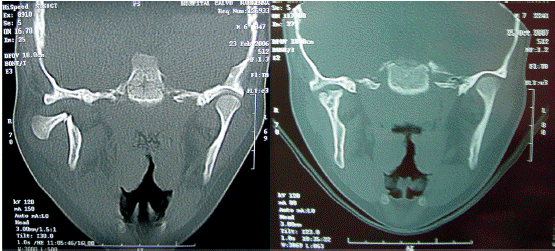 Las fracturas de cóndilo requieren de un manejo de urgencia y un posterior tratamiento que puede ser quirúrgico u ortopédico-funcional por parte del cirujano maxilofacial. En cuanto al manejo de urgencia de una fractura de cóndilo en un paciente en crecimiento, éste debe abarcar el control del dolor con el uso de AINES y dieta blanda, además de una movilización temprana de la articulación por medio de movimientos mandibulares repetitivos (apertura-cierre, lateralidades), para así impedir una consolidación ósea en una posición alterada, lo que puede llevar a graves secuelas. Las secuelas por un tratamiento inadecuado son complejas y pueden manifestarse como una alteración severa en el crecimiento mandibular o una anquilosis de la ATM, que se manifiesta como una disminución o imposibilidad de movimiento. Esto se debe a que existe una fusión del hueso temporal con el cóndilo mandibular. Cuando esto ocurre en un paciente en crecimiento, la anquilosis impide que el desarrollo mandibular se produzca en forma normal, lo que se traduce en alteraciones en el crecimiento, asimetría facial y restricción o imposibilidad de realizar movimientos mandibulares, por lo tanto, una apertura bucal disminuida o nula (Figura 4).