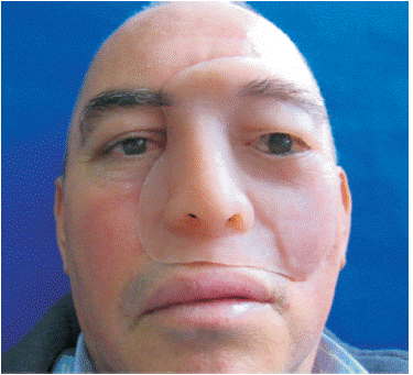 Dos meses después acude al Servicio de Prótesis Maxilofacial para valoración y se aprecia que el paciente ha desarrollado una adecuada adaptación a la prótesis facial mostrando una actitud de aceptación. A la exploración física se observa granulación de tejidos circundantes al defecto, así como del tejido óseo; y una vez que se corrobora con el Servicio de Cabeza y Cuello que no hay actividad tumoral, se decide iniciar con la prótesis definitiva (Figura 3).