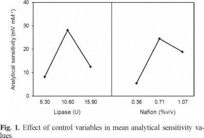 The effect of the amount of lipase and Nafion concentration on the sensitivity of the potentiometric biosensor of TG, was studied using a full factorial design with three levels 32. Membrane formulations were set by varying the amount of lipase (5.30-15.90 U) and final concentration Nafion (0.36-1.07% v/v) in 140 μL of PBS (1 mM, pH 7.0). Once constructed biosensors, the analytical sensitivity was determinate in the range from 0.08 to 0.48 mM. The matrix design and results obtained are shown in Table 1.