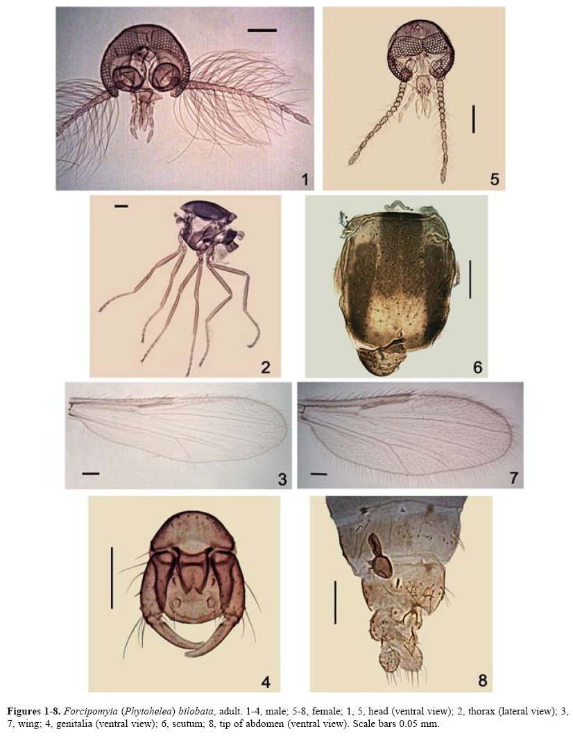 Types. Holotype male with pupal exuviae on microscope slide, labeled "HOLOTYPE Forcipomyia (Phytohelea) bilobata Marino. Argentina, Corrientes prov., arroyo Toropi, 28°35'40.4" S, 59°02'00.9" W, 55m, 16-IX-2010, R. Campos, ex Eryngium L., (MLP). Paratype female with pupal exuviae: same data as holotype (MLP). The pupae were collected at the same locality and date from Eryngium L. sp., and laboratory reared pupae emerged in 2-3 days at 12° C.