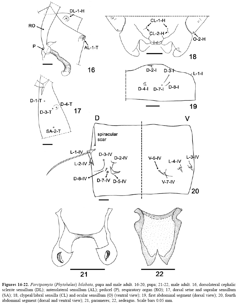 Remarks. This new species belongs to the F. bromelicola species group defined by de Meillon and Wirth (1979) by the presence of 2 spermathecae and 13 antennal flagellomeres. The adult of F. (P.) bilobata is very similar to F. (P.) jocosa Saunders by the presence of well developed empodia; however, the latter species exhibits an elongate third palpal segment, the 8 basal flagellomeres are strongly compressed, and the thorax is entirely dark brown. The male has the apex of aedeagus with 2 lobes separate by a shallow gap. The pupa of F. jocosa was incompletely described by Saunders (1956) based on 2 pupal exuviae; however, the outer seta of the terminal process of F. jocosa is very reduced, and the D-5-IV of the fourth abdominal segment is clearly stouter. The sensillar pattern of the fourth abdominal segment of this new species is similar to that of F. (P.) bromelicola. The pupa of F. bromelicola differs from F. bilobata by the presence of a rounded dorsal apotome, with a minute sensilla and by the terminal processes of the segment 9 as long as their bases, each of them with a longer outer seta.
