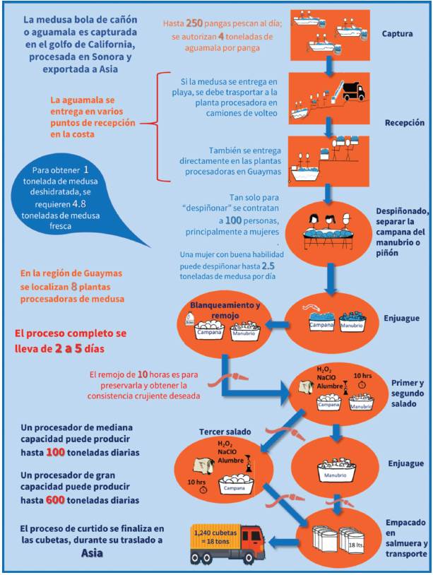 En México, la medusa bola de cañón (MBC) (Stomolophus sp. 2)1 o aguamala, como se le conoce en la región, es capturada desde 2001 en el golfo de California, debido a su gran demanda para consumo humano en China, Japón y Malasia. El esquema de surgimiento y desarrollo de la pesquería de esta medusa es el mismo que el de abulón, atún y sardina implementado en el Pacífico en 1912, y después el de camarón, en el Pacífico y golfo de California en 1935. Dichos recursos fueron detectados por japoneses, que llegaron a Baja California para explotarlos con buzos, pescadores y barcos. De 1912 a 1941 obtuvieron permisos, convenios y concesiones para extraer los productos (Velázquez-Morales, 2007). La medusa fue detectada desde principios del año 2000, en la actualidad se extrae en campos pesqueros entre el norte de Sinaloa y el golfo de Santa Clara, en Sonora, y en San Felipe, Baja California; se deshidrata y empaca en Guaymas, Bahía de Kino y Puerto Peñasco, Sonora, para exportarla a Vietnam y Singapur, país que la revende sobre todo a China y Japón. Este producto no se exporta a China directamente, debido a los altos costos de los impuestos y a la larga lista de requerimientos que exige el gobierno de ese país para introducir alimentos marinos (Congreso Popular Nacional, 2009).