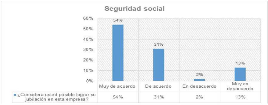 Finalmente, como parte del instrumento utilizado se indagó acerca de la “seguridad social”. Para ello, se preguntó sobre la posibilidad de lograr la jubilación en la EES donde trabajaba. Como respuesta a ello, 54% de los participantes manifestaron que sí sería posible que puedan alcanzar su jubilación en la organización donde hoy en día están vinculados laboralmente. En la ilustración que se presenta en la siguiente página, se hace referencia a algunos elementos ofrecidos por las empresas, los cuales fueron definidos y vinculados en esta categoría, forman parte de ese indicador relacionado con ésta y son parte fundamental de las garantías que se deben ofrecer para contar con un trabajo decente, según los lineamientos formulados por la OIT.
