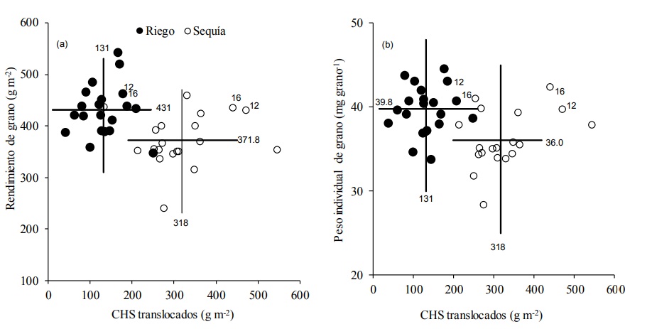 Ehdaie et al. (2008) encontraron en conjunto de 11 genotipos diversos de trigo que los asimilados actuales y las reservas en los tallos contribuyeron entre 19.1 a 53.6% en riego, mientras que en sequía el rango fue de 36.6 a 65.4%. La variabilidad en las reservas acumuladas y aquellas remobilizadas hacia el grano depende del genotipo, magnitud del estrés e incluso del método utilizado para medir los CHS (Ehdaie et al., 2006).
