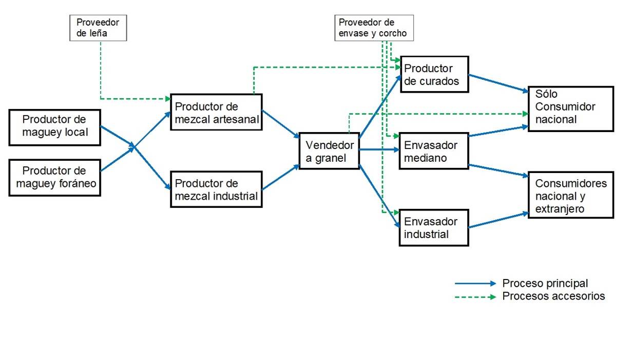 Se encontró que la interacción entre los actores de la cadena no es lineal y tiene un carácter complejo debido a su dinámica, sobre todo porque los actores no se limitan a un solo proceso en la cadena, sino que al mismo tiempo están en varios eslabones o en ocasiones abarcando la cadena completa. Al interior de cada eslabón predomina la acción individual de los actores y la dispersión geográfica, no existen mecanismos de articulación entre los actores, ni de comunicación, intercambio o cooperación. Ello se debe principalmente a que no existe una cultura de organización, lo que se debe a que sus actividades principales son diferentes a la producción de mezcal Keshelashvili (2018).