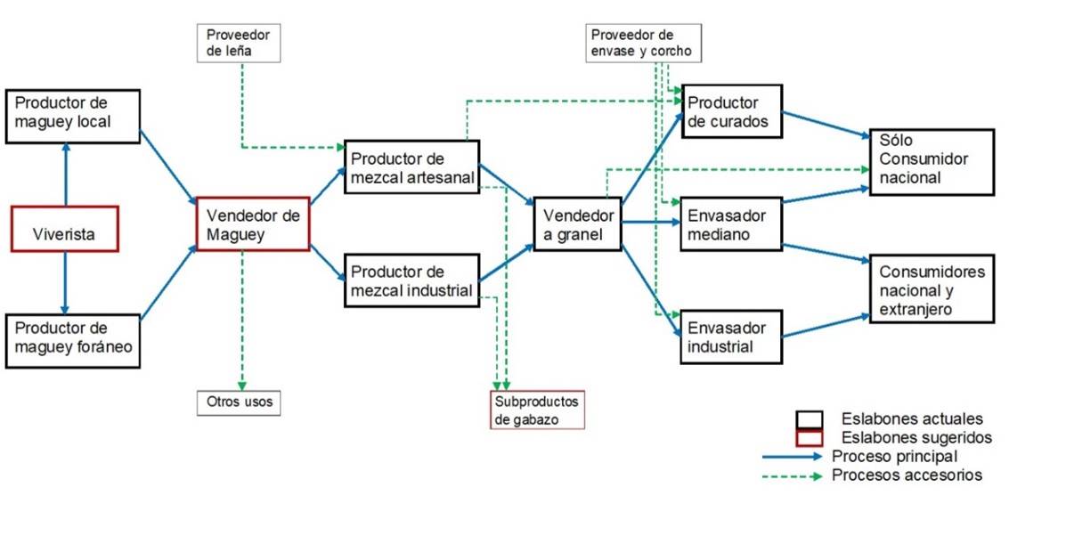 Como se menciona anteriormente la mayoría de las plantas de agave son silvestres, para lo cual se considera la incorporación del eslabón de viverista (productor de plántulas hasta que alcanza el estado adecuado de distribución y venta), esto con la finalidad de poder tener una explotación sustentable, y poder asegurar el abasto de piña de agave. Relacionado a la explotación de los recursos naturales se propone tomar en cuenta el eslabón de vendedor de maguey, dado que varios productores de mezcal son ejidatarios, conforme a los acuerdos de la asamblea ejidal se les permite la extracción de cierta cantidad de kilos o plantas de agave (cantidad que varía de ejido a ejido), no se tiene un control de cuanto maguey silvestre se está extrayendo, por lo cual se propone la incorporación de este agente con la finalidad de tener una regulación y control de la explotación y hacerlo de manera amigable con el ambiente considerando capacitaciones constantes a los ejidatarios en cuanto al manejo sustentable de los recursos.