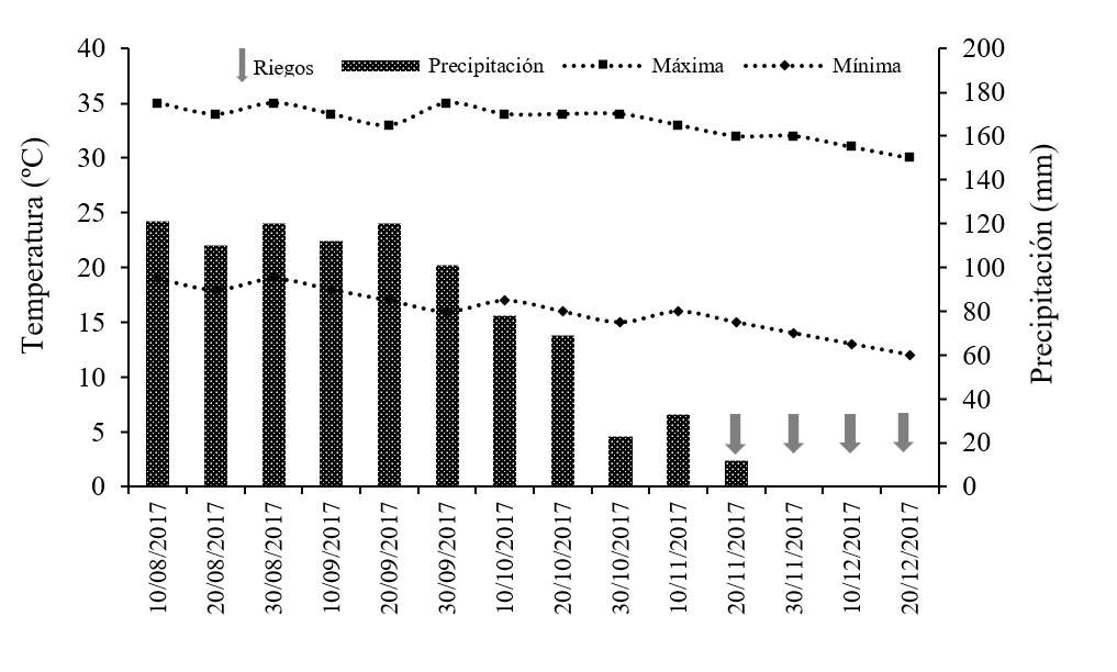 La maleza se controló de forma manual con ayuda de azadón, se realizaron dos fertilizaciones nitrogenadas comprendiendo 100 y 150 kg ha-1 con urea (46-00-00) depositado en el suelo en bandas a 3 cm de profundidad y a 10 cm de distancia de la planta aplicándose a los 48 y 67 días después de la siembra, respectivamente. Ocho días antes de iniciar los análisis de crecimiento el 12 de octubre de 2017 se realizó un corte de homogenización a una altura de 10 cm en todas las parcelas experimentales de forma manual con ayuda de tijeras podadoras. Se proporcionaron 4 riegos con el método de goteo en los meses de noviembre y diciembre cada diez días hasta capacidad de campo con una lámina neta de 200 mm para el buen rebrote de los pastos (Figura 1).