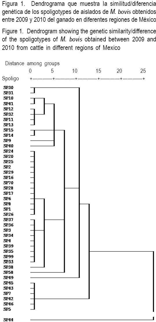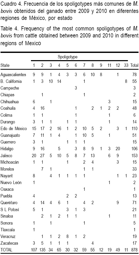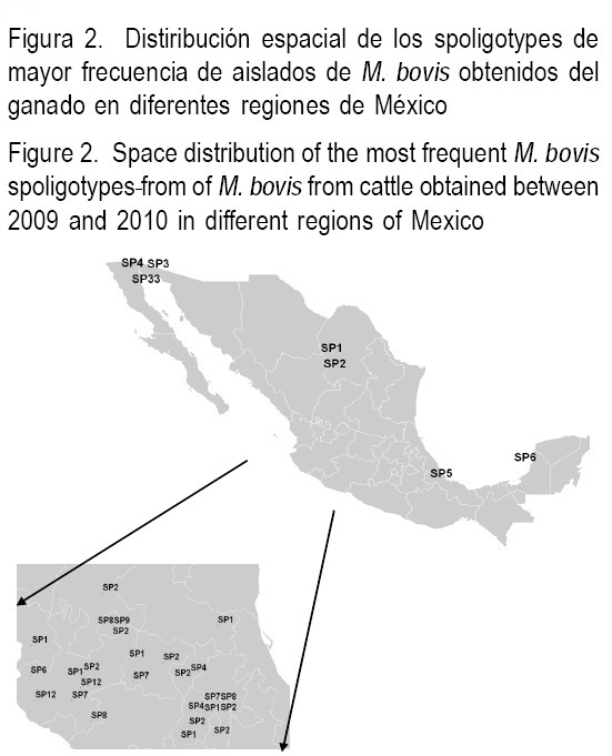 A partir de 878 aislados de M. bovis obtenidos del ganado en diferentes regiones de México se generaron 197 espoligotipos, 45 con dos o más aislados y 149 con sólo uno. Los espoligotipos más frecuentes fueron SP1 y SP2, presentes en la mayoría de los estados representados, en especial en aquéllos tradicionalmente enfocados a la producción de leche. La mayoría de los espoligotipos que involucran a un solo aislado son muy parecidos a los espoligotipos de mayor frecuencia en la muestra, la diferencia en la presencia/ausencia de espaciadores en la mayoría de los casos es de sólo uno, lo que sugiere que estos son el resultado de nuevas líneas genéticas derivadas de mutaciones no letales en infecciones recientes.