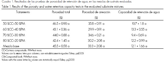 Las pruebas de porosidad indicaron que no hay diferencias significativas entre las variables evaluadas (Cuadro 1). En el caso de la porosidad total, los valores variaron de 44.0 a 46.5 %; de acuerdo con lo publicado por Landis et al. (1990), el intervalo apropiado para este parámetro debe ser de 60 a 80 %. La porosidad de aireación fluctuó de 30.2 a 35.8 %, mientras que el recomendado, por los mismos autores es de 25 a 35 %, lo que indica que, salvo el tratamiento de 50 % de corteza compostada + 50 % de peat moss, los demás están en el criterio sugerido. La capacidad de retención de humedad tuvo registros de 9.4 a 12.1 %, valores fuera de lo citado (25 a 55 %) por Landis et al. (1990). Prieto et al. (2012) señalan que una alternativa para la producción de mezquite es utilizar como sustrato corteza compostada en una proporción de 50 a 70 %, mezclada con 30 a 50 % de peat moss. Independientemente de la proporción de los sustratos a utilizar, es importante considerar el tamaño de las partículas de cada componente, ya que influye en la retención de agua en el medio de crecimiento (Ansonrena, 1995); en este caso, los materiales que influyeron para que la porosidad total fuera baja fue principalmente la corteza.