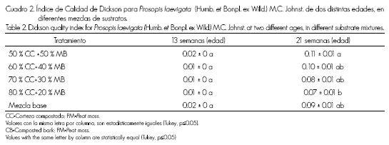 Respecto al Índice de Calidad de Dickson, solo se evaluó a partir de las 13 semanas, y se determinó un intervalo de 0.01 a 0.02, sin que existieran diferencias significativas. A las 21 semanas de edad, fue de 0.07 a 0.11, y la mezcla compuesta por 50 % CC y 50 % MB se ubicó en el grupo estadístico superior, mientras que la menor calidad se obtuvo en el sustrato con mayor proporción de corteza compostada (Cuadro 2).