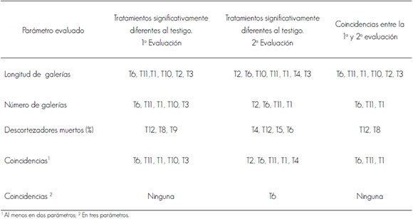 Al comparar los datos de la primera y la segunda evaluación (Cuadro 2) se observa que únicamente los tratamientos T4 y T6 (acefate 5 % y 12 %) coinciden con el resultado de la longitud de galerías y solo el T6 (acefate 12 %) fue significativamente diferente al testigo en los tres parámetros evaluados, por lo que se podría sugerir como el mejor tratamiento utilizado.