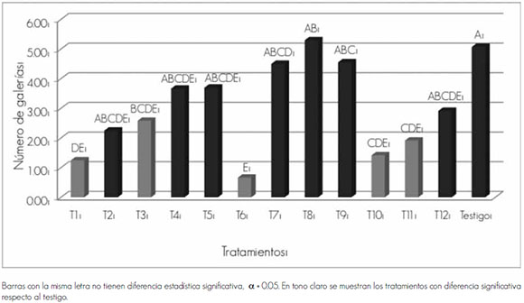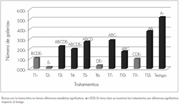 Se observó un mayor desarrollo de los sistemas de galerías en los árboles testigo y en aquellos tratamientos con poca efectividad biológica. Se obtuvieron diferencias significativas con respecto al tratamiento testigo para el parámetro de longitud de galerías en los tratamientos T6, T11, T1, T10, T2 y T3, anotados de mayor a menor eficiencia (Figura 2), un comportamiento similar se determinó para el número de galerías (principales y larvales), con la excepción del T2 (Figura 1).