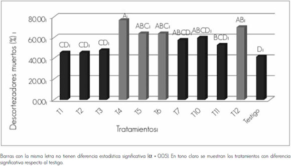 En el caso del porcentaje de insectos descortezadores muertos, no se cubren los requisitos de normalidad y homocedasticidad por lo que se utilizó Anova de rangos de Friedman, seguida de la prueba de LSD (diferencia mínima detectable) en los rangos; se tuvieron diferencias significativas en los tratamientos T12, T8 y T9, en ese orden (Figura 3), aunque estos no se muestran muy eficientes con los parámetros analizados anteriormente.
