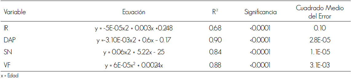 Los modelos de regresión para IR, DAP, SN, VF y la edad fueron analizados y el volumen de fuste se calculó mediante la fórmula de Smalian (Prodan et al., 1997):